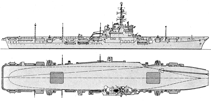 V2(fd ~ 6,500 m², ha - 2,142m² / 11,355m³): Flight deck: 210.3x36.9m; hangar: 138.7x15.8x 5.3m. Two lifts: 13.7x10.4m, 6.8t. 1 catapult BH-III (6.4t plane was launched at 122km/h). Aircraft fuel stowage: 448,200l.