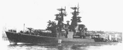 | Armament | 2 x 4 P-35 SSM (16 4K44), 1 x 2 M-1 Volna SAM (16 V-600(4K90)), 2 x 2 - 76/59 AK-726, 2 x 1 - 45/66 21KM, 2 x 3 - 533 TT, 2 x 12 RBU-6000 Smerch-2 ASWRL, helicopter deck for 1 Ka-25 |