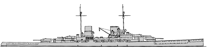 The main belt ran from the fore barbette to a little past the after one, and was 300mm from 1.4m above to 0.4m below lwl tapering to 150mm at the lower edge 1.7m below lwl and to 230mm at the upper deck. Forward there was 120-100mm and 100mm aft. The barbettes were 260mm with the two superfiring ones reduced to 100mm behind the battery armour and all to 60mm behind the main belt with the two forward ones further reduced to 30mm below the upper main deck. The turrets had 270mm faces and rears, 220mm sides and 110-80mm roofs. The armour deck was 30mm amidships, 50mm forward and 80-50mm aft, and the upper deck 30-20mm outside the battery which had a 50-25mm roof. The torpedo bulkhead ran for the length of the main belt and was 45mm, continuing to the upper deck as a 30mm splinter bulkhead.