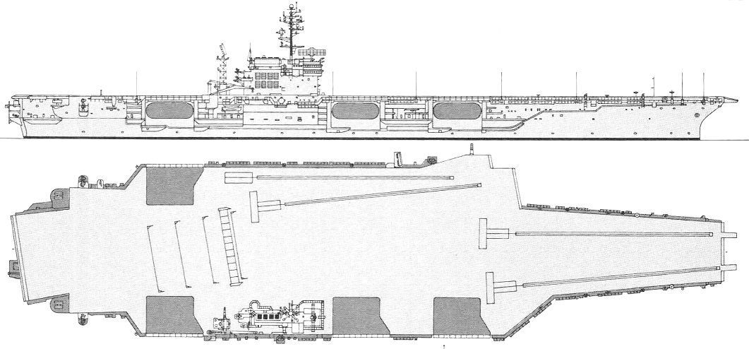 (CV66, 67)(fd - 20,000 m², ha - 6,945 m² / 52,785 m³): Flight deck: 310.2x 73.0m. Hangar: 225.5 x 30.8 x 7.60 m. There were 4 deck-edge elevators (40t, 21.4/25.9 x 15.9m). There were 3 C13 and 1 C13-1 catapults. Aircraft fuel stowage: 353 500 l of petrol and 6 955 000 l of JP-5 jet fuel. Aviation ordnance stowage was 1800t.